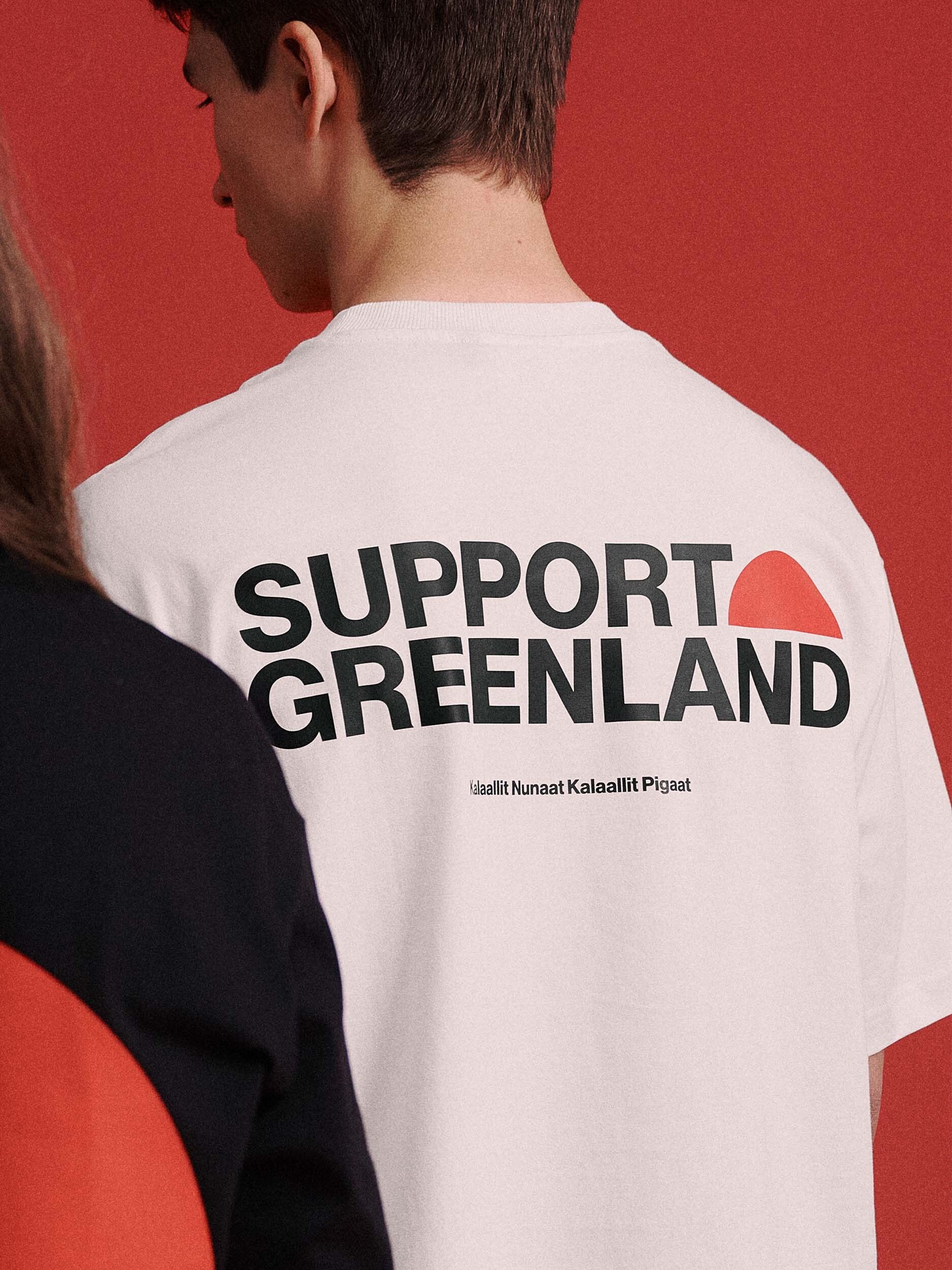 • Stort ryggtryck med "SUPPORT GREENLAND" och texten "Kalaallit Nunaat. Kalaallit Pigaat"