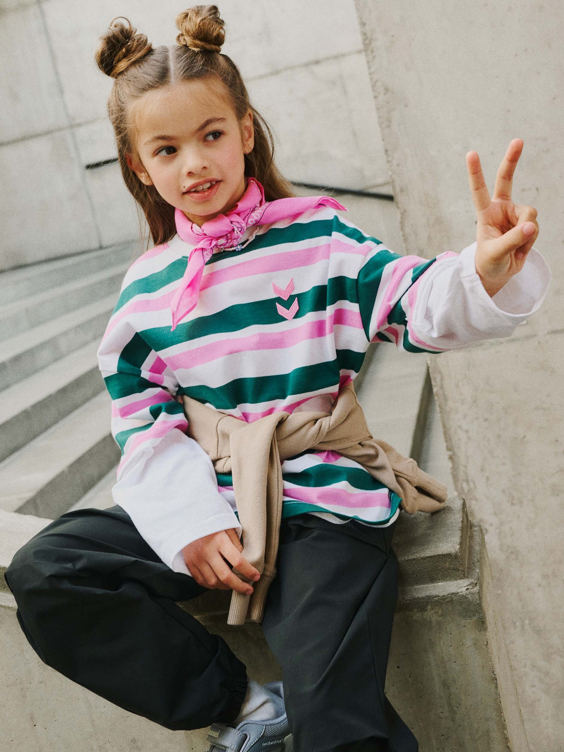 hmlJR SILLY T-SHIRT L/S är tillverkad av ett mjukt, stickat jerseytyg och kombinerar ett horisontellt randigt mönster med en kontrasterande inbyggd långärmad effekt. Designen skapar en look av en T-shirt i lager över en långärmad topp - allt i en och samma stil. Den lösa silhuetten, den runda halsringningen och den broderade hummel-logotypen på bröstet fulländar designen.